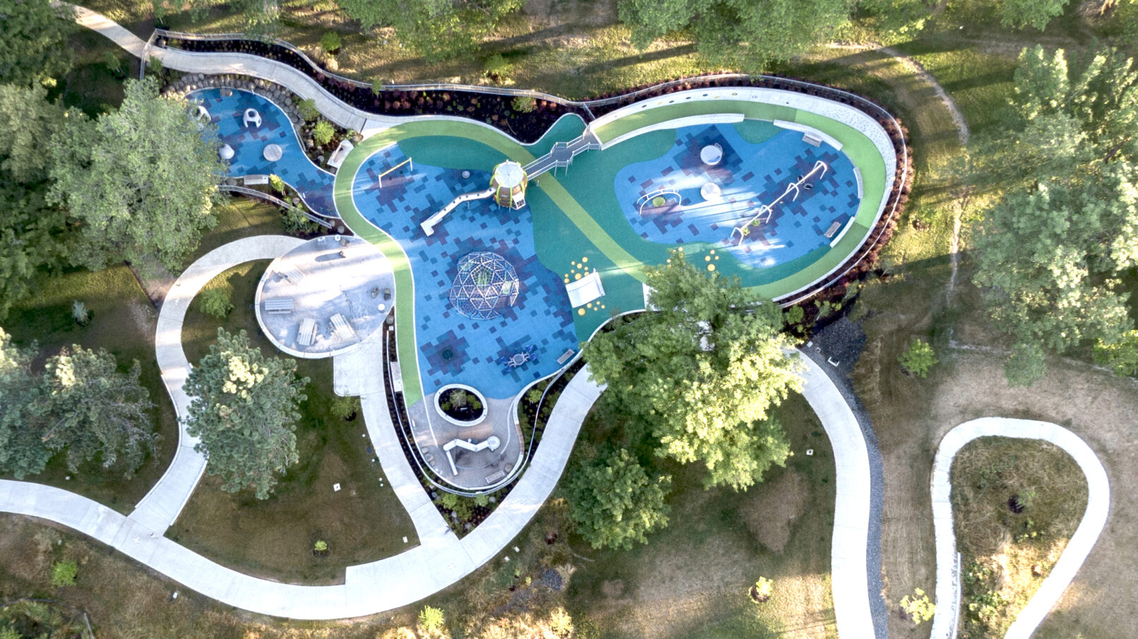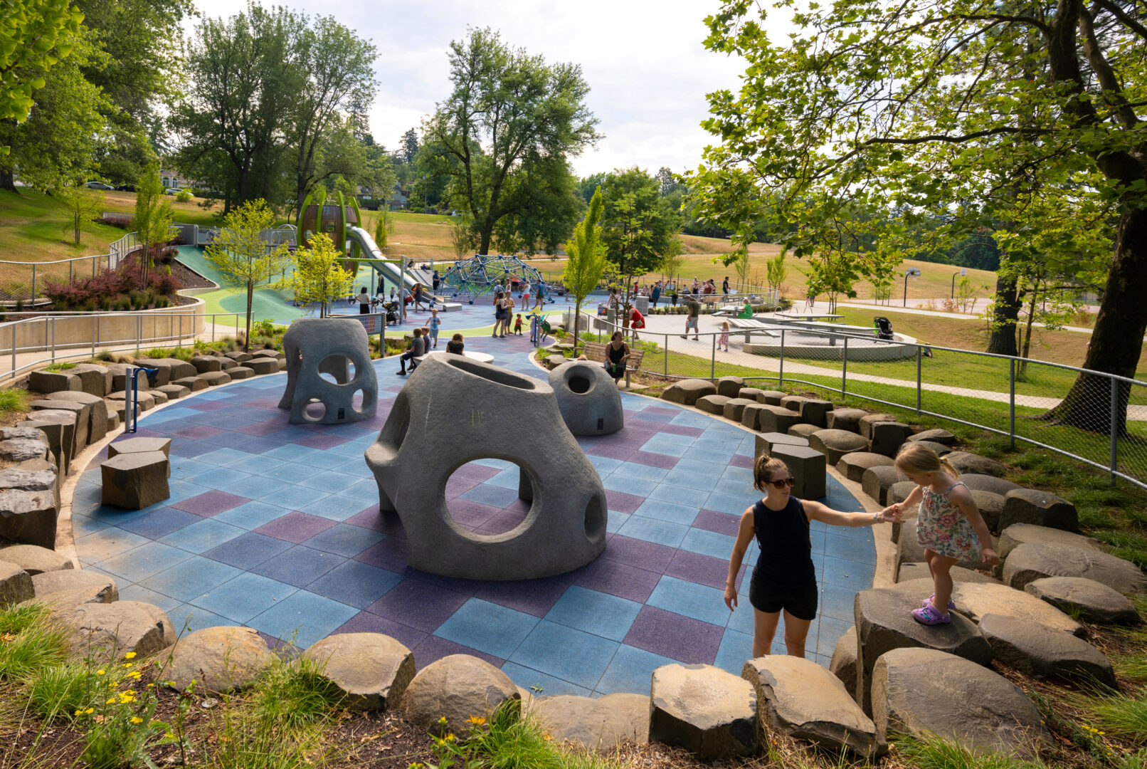 The Gabriel Park Playground is Portland’s newest and most inclusive playground, tucked into the northeast corner of Gabriel Park, a 91-acre park in SW Portland. The 10,000 square foot playground was designed in collaboration with a unique stakeholder group – a collection of community members, adults with disabilities, and parents of children with mobility, cognitive, and developmental challenges. The result is a multi-tiered and engaging public play space nestled into the hillside of the existing park. The carefully graded design protects existing trees and watersheds and creates new accessible connections both throughout the playground and to nearby public pathways, parking, restrooms, and public transit. The dynamic spaces created by a mix of custom and classic play elements fit the park design and draw people to the space from across the city.