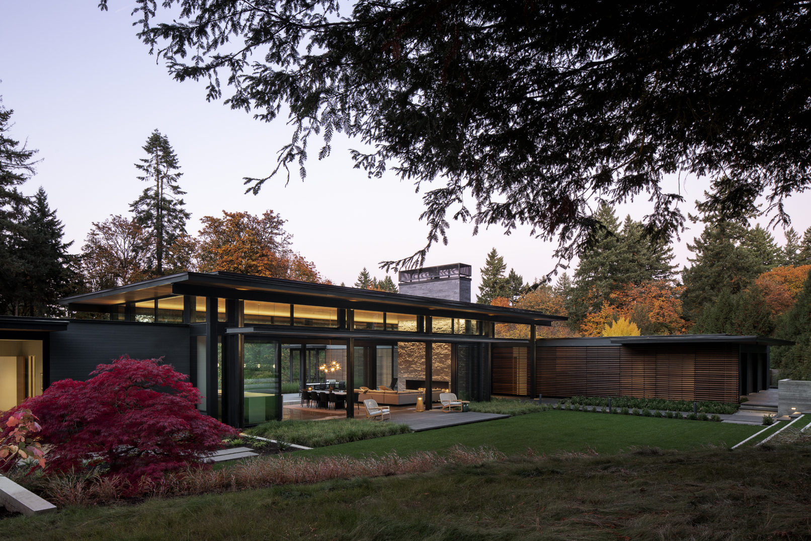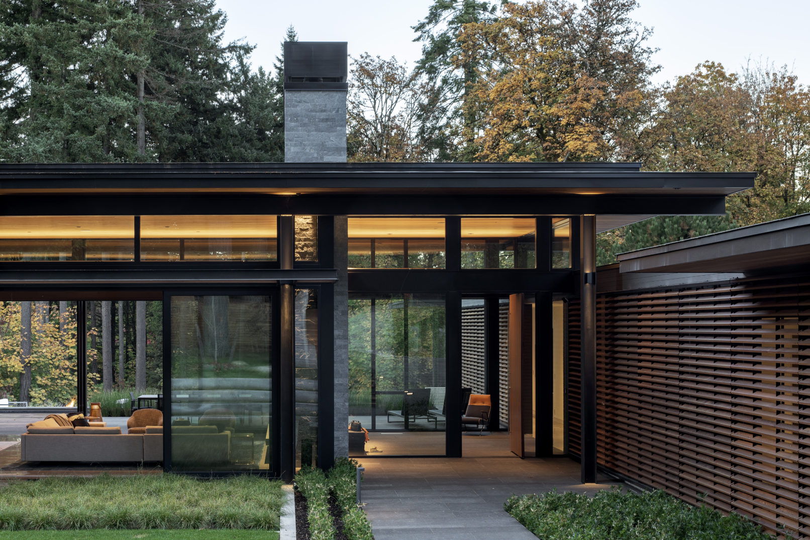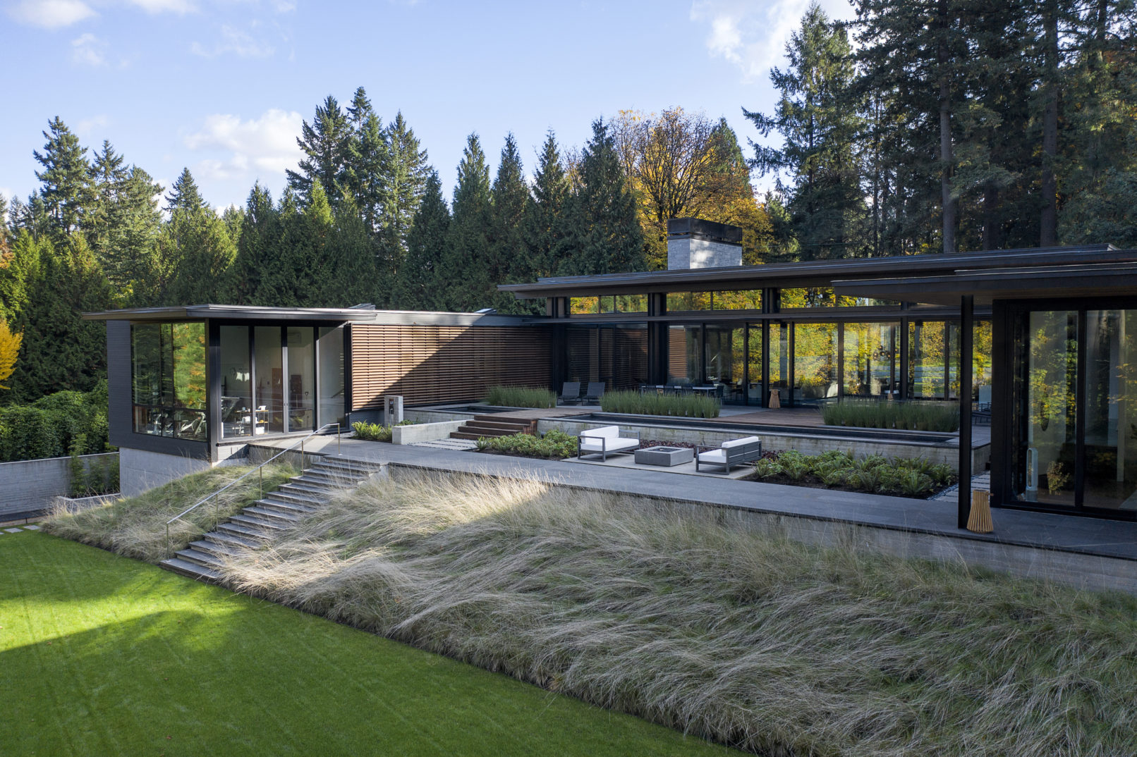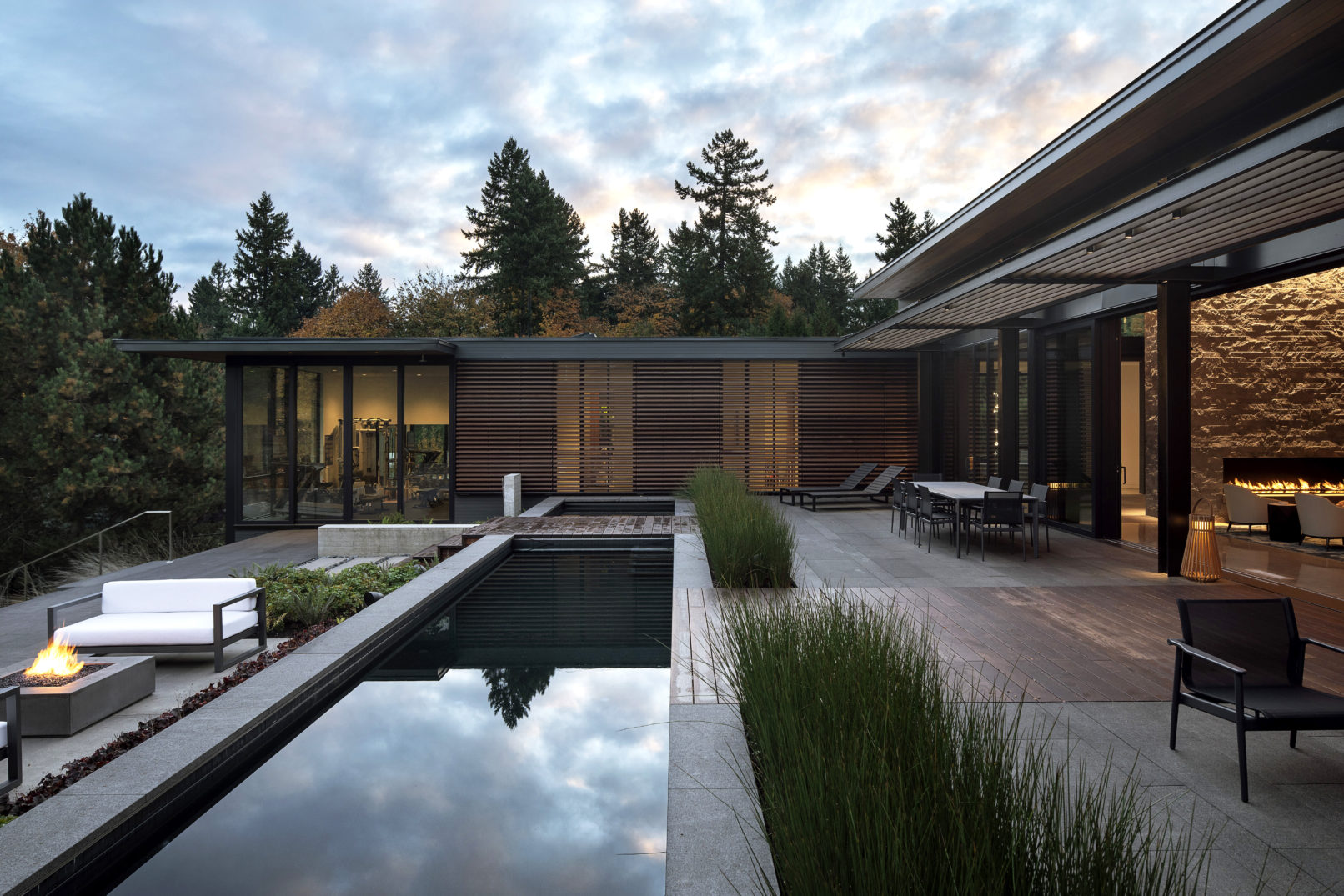 Located in the Southwest hills outside of Portland, this minimal interpretation of a Japanese garden utilizes carefully considered manipulation of site topography, a series of terraced gardens and site walls to seamlessly connect architecture and landscape. Situated between two existing stands of evergreens, the new residence’s spartan combination of glass, concrete, natural stone and wood is reflected in the material palette of the landscape. A central terrace includes a lap pool and spa, and aims to resonate with the central living spaces and borrowed landscape beyond.
