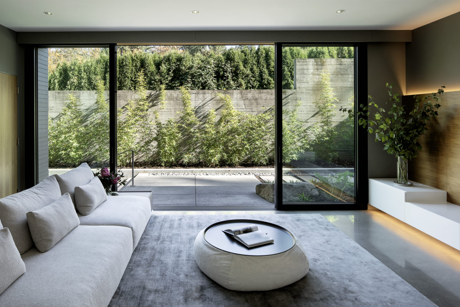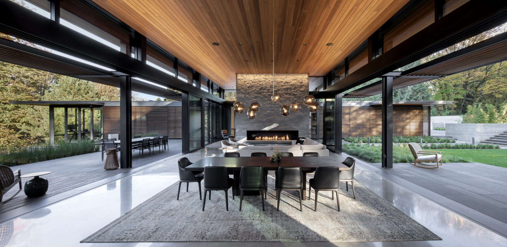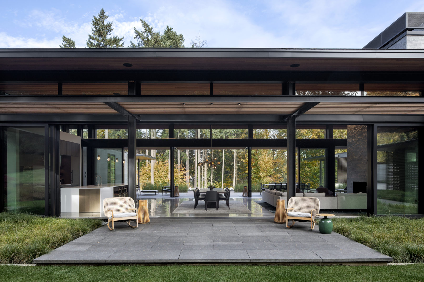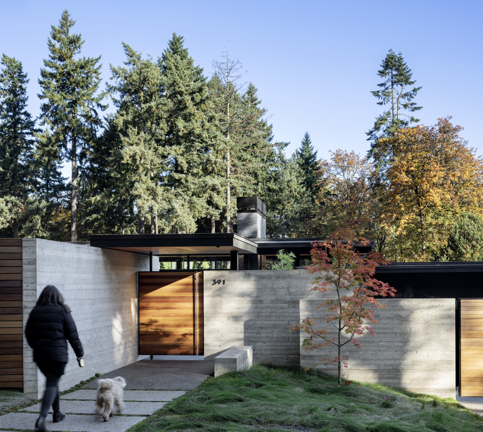 Located in the Southwest hills outside of Portland, this minimal interpretation of a Japanese garden utilizes carefully considered manipulation of site topography, a series of terraced gardens and site walls to seamlessly connect architecture and landscape. Situated between two existing stands of evergreens, the new residence’s spartan combination of glass, concrete, natural stone and wood is reflected in the material palette of the landscape. A central terrace includes a lap pool and spa, and aims to resonate with the central living spaces and borrowed landscape beyond.