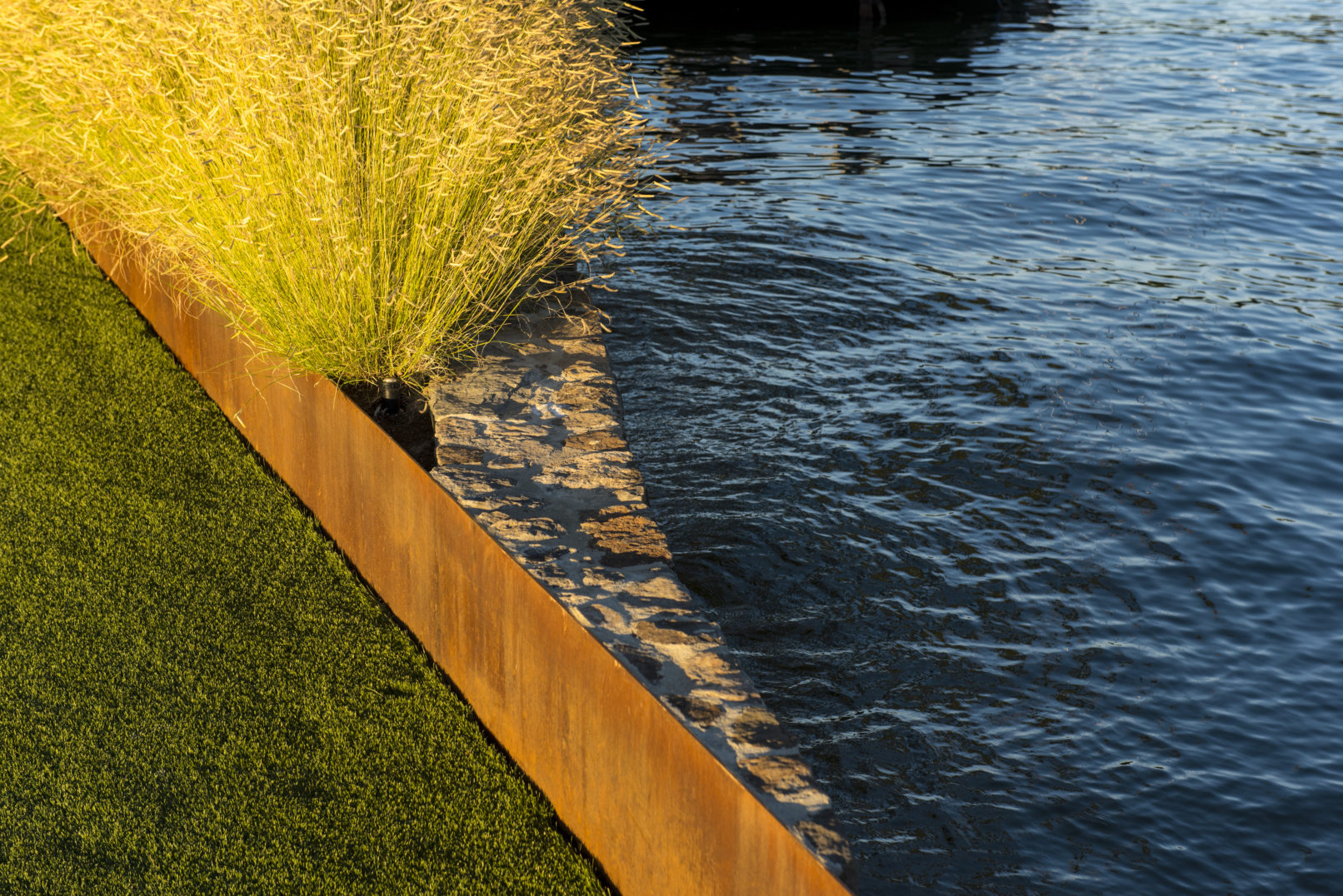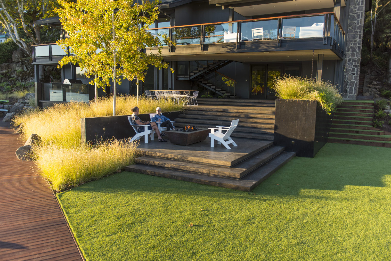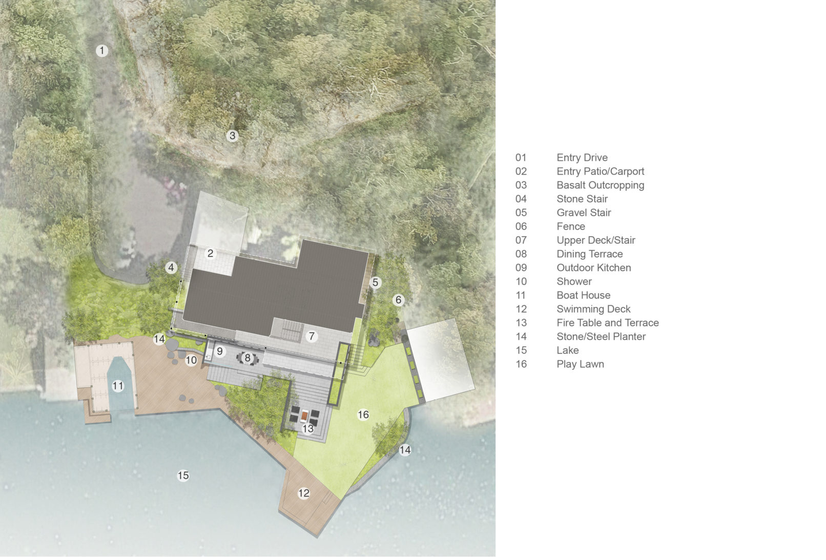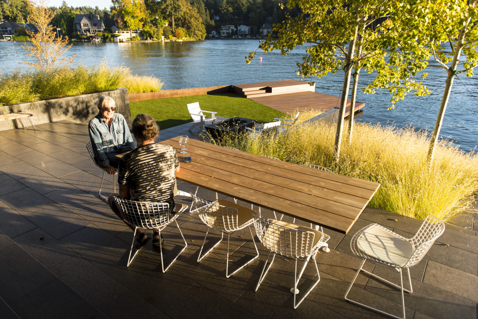 The landscape architect teamed with a craftsman who understood and appreciated Gordon’s original design intent for the house. The team engaged with the client in an ambitious plan to reconnect the house to the landscape and create functional spaces outside for recreation and entertaining. The result is a landscape worthy of Gordon’s vision of the house: a unification of inside and outside in a beautiful lakeside setting.