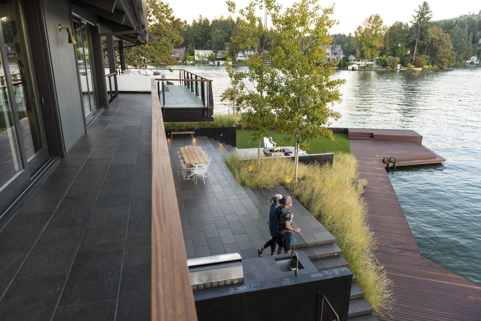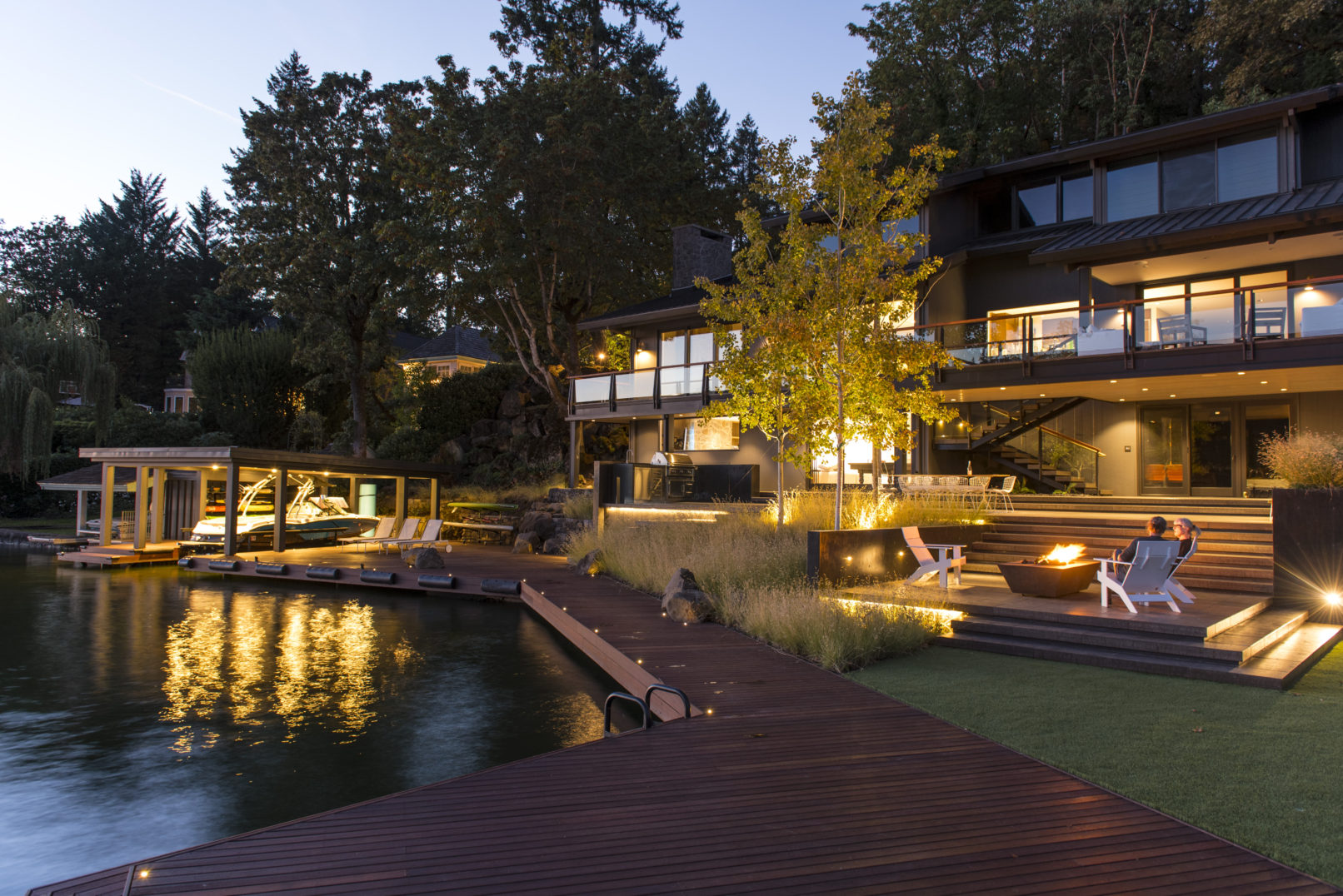 Nestled into dramatic basalt cliffs on the north side of Lake Oswego, the residence, originally designed by acclaimed Northwest architect Walter Gordon in 1967, was disconnected from its relationship to the outside and lake below. The existing basalt formation, which the clients affectionately call the “Big Rock Candy Mountain”, shields the house from the roadway and directs all energy towards the lake itself. Physical access to the water’s edge is had by descending over 20’ from the home’s main entrance. The lower terraces of the house were small, unusable, and related poorly to Gordon’s architecture.